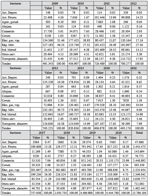 El análisis de los valores absolutos (tabla 11) permite evidenciar que el incentivo fiscal por inversión en activos fijos fue aprovechado en especial por los sectores "explotación de minas y canteras" con cerca de 9 billones de pesos, "servicio de transporte, almacenamiento y comunicaciones" con más de 7.5 billones y "electricidad, gas, vapor y agua" que superó los 6.5 billones en esta deducción especial.