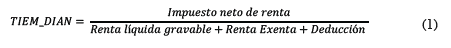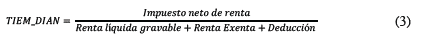 Con el fin de contrastar los resultados del TIEM_F, se calculó otro TIEM, que se denominará TIEM-DIAN y que consiste en aplicar un indicador que se asimila al empleado por Avendaño et ál., (2019), aunque, usando las cifras de la base de datos depurada como se indicó previamente. Este indicador, que se puede apreciar en la Fórmula 3, emplea en la renta líquida gravable el mismo cálculo usado para el TIEM_F, las rentas exentas y la deducción, que corresponde específicamente a la deducción por inversión en activos fijos.