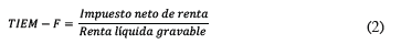 En este trabajo se propone calcular el TIEM Fiscal (en adelante, TIEM-F), utilizando la Fórmula 2, medida que se asimila más a los TIEM propuestos en reconocidos estudios sobre presión fiscal, entre ellos Zimmerman (1983), Porcano (1986), Gupta y Newberry (1992, 1997), Omer, Molloy y Ziebart (1993) y, Collins y Shackelford (1995). Al realizar el cálculo del TIEM-F se logra una aproximación a la presión fiscal empleando datos de las declaraciones tributarias y no datos contables.