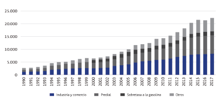 El boletín de resultados del índice de desempeño fiscal 2020, publicado en junio de 2021, muestra la evolución que han tenido los impuestos municipales desde el 2000, en el cual se destaca que el IPU representa el 37.5 % de los impuestos municipales y que ha tenido un crecimiento superior al 200 % entre 2000 y 2020. Además, el DNP destaca que el IPU se consolidó como el impuesto más importante para el 2020, de hecho, fue el único que tuvo crecimiento en ese año, pasando su recaudo de 9.4 a 9.6 billones de pesos constantes (figura 2).
