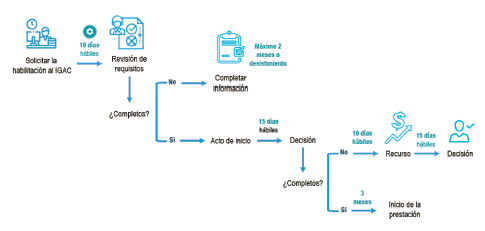 En el proyecto tipo de actualización catastral con enfoque multipropósito (DNP, 2020, p. 27) señaló que el procedimiento para la habilitación de los gestores catastrales sería el siguiente: