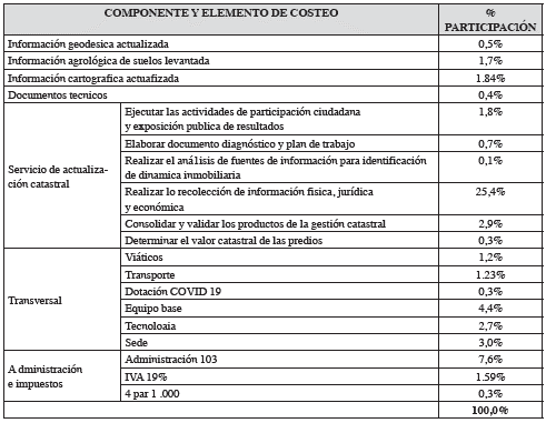 Ante la dificultad de encontrar casos similares de costos de actualizaciones catastrales, resulta necesario realizar la estimación con base en la Resolución 481 de 2020, "por la cual se fijan los precios unitarios de venta de los productos y servicios a cargo de Instituto Geográfico Agustín Codazzi (IGAC) y se dictan otras disposiciones" (IGAC, 2020) y la Guía de actualización catastral con enfoque multipropósito (DNP, 2020).