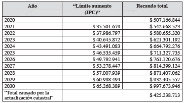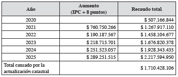Nota: la proyección se realiza a 5 años por razón de la vigencia de la actualización catastral. Para el año uno, el aumento se calculó con el límite del artículo 6 de la Ley 44 de 1999. Para los años sucesivos se aplicó un aumento del UPC + 8 y se tomó como referencia una inflación del 7 %.