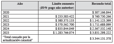 Si asumimos que para el año uno posterior a la actualización catastral el impuesto aumenta por el monto máximo permitido, tendríamos lo siguiente: