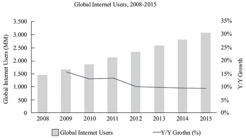 Así mismo, permite visualizar la proyección del crecimiento de las ventas a través del comercio electrónico para el quinquenio 2012-2017, respecto a lo cual se observa una tendencia a la disminución, pues pasa de un crecimiento del 22,2% en 2012 a un 14,8% en 2017, lo cual obedece al desaceleramiento del crecimiento de los usuarios de internet que, durante los años 2014 y 2015, presenta un crecimiento del nueve por ciento (9%), en contraste con el quince por ciento (15%) registrado en el año 2009 (KPCB, 2016).