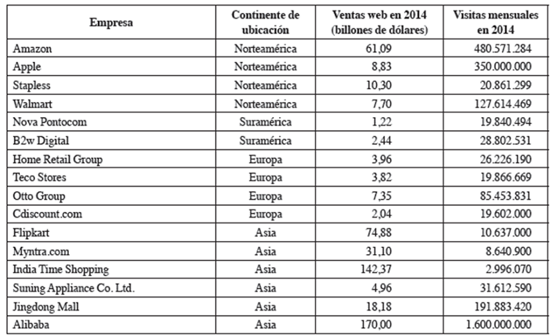 Al respecto, se puede observar que el mayor volumen de ventas a través del comercio electrónico se concentra en Asia, con un valor de total de ventas en el año 2014 de 441,49 billones de dólares, concentradas en seis compañías, seguido por Norteamérica, que tuvo ventas a través del comercio electrónico en este periodo por valor de 87,92 billones de dólares, concentradas en cuatro compañías.