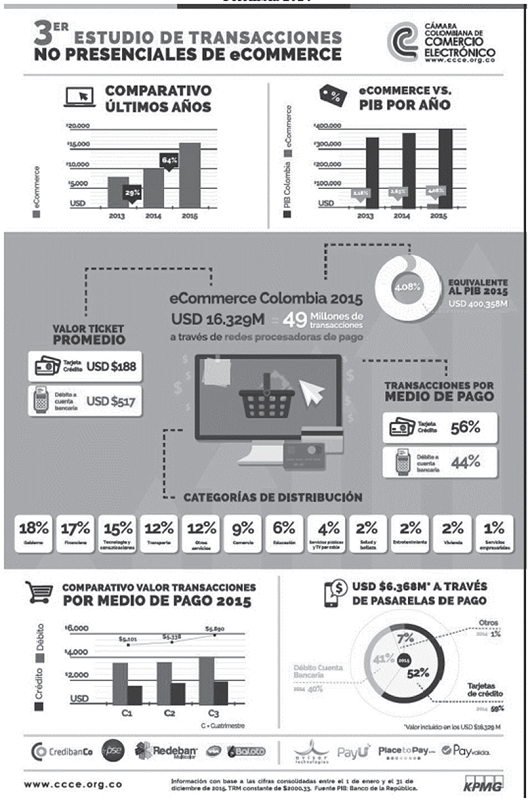 En ese mundo virtual se desarrollan negocios, y según la Agencia de las Naciones Unidas para el Comercio y el Desarrollo (UNCTAD 2016), se mueven 25 billones de dólares, de los cuales el 90% corresponde a tratos entre empresas B2B, y el restante 10% al comercio B2C. Para el caso de Colombia, según las cifras registradas por la Cámara de Comercio Electrónico, en el año 2015 se generaron transacciones por valor de USD 16.329 millones.