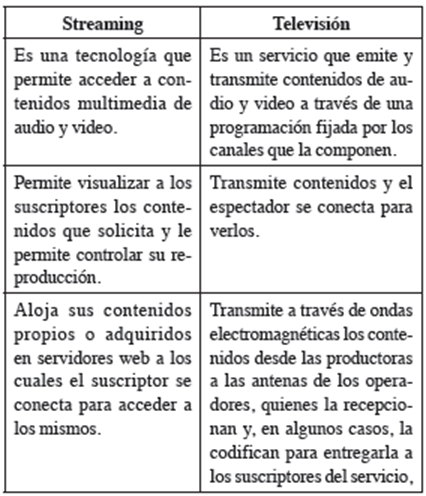 El streaming es una tecnología que permite la visualización de archivos multimedia (audio y video) directamente desde la web del proveedor del servicio sin descargarlo previamente al equipo tecnológico, que se usa para visualizarlo. Este servicio permite visualizar el contenido en la medida en que se va descargando, sin necesidad de almacenarlo en el equipo (Cehis, 2013).