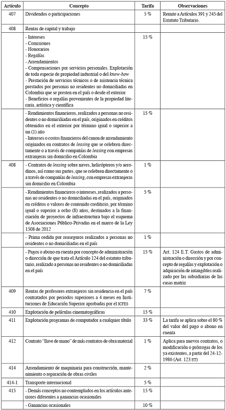 Igualmente, los pagos realizados a no residentes por concepto de dividendos, intereses, regalías y alquileres, servicios prestados en Estados Unidos de América, se les practica retención en la fuente del 30% .