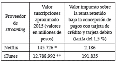 Partiendo de las cifras expresadas en el aparte IV del Capítulo 2 de este texto, es relevante indicar que Netflix en Colombia, a cierre de 2015, percibía ingresos de fuente nacional por valor de $145.726 millones , los cuales, al aplicarle la retención prevista para pagos con tarjeta crédito y tarjeta debito generarían un recaudo del impuesto de renta que grava dichas rentas por valor de $2.186 millones, cifra que hoy por hoy se fuga de los ingresos tributarios del país por la falta de aplicación de esta retención en la fuente por parte de las entidades emisoras de tarjeta débito y crédito, previa la directiva respectiva por parte de la Administración Tributaria.