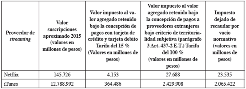 Teniendo en cuenta lo citado en los párrafos anteriores y partiendo de las cifras presentadas por el Departamento Nacional de Planeación - DNP en el foro "El futuro del sector audiovisual en el mercado de la convergencia tecnológica en Colombia" , en las cuales enuncia algunos de los ingresos percibidos por las sociedades extranjeras no residentes en Colombia por suscripciones de streaming de usuarios residentes y/o domiciliados en el país para el año 2015, es relevante calcular el monto del IVA que se podría recaudar aplicando la retención en la fuente por IVA prevista por el Artículo 437-1 del Estatuto Tributario en concordancia con el numeral 5 del Artículo 437-2 del Estatuto Tributario, y compararlo con el valor total de impuesto al valor agregado que se podría recaudar sobre los ingresos de las sociedades extranjeras proveedoras de streaming en Colombia, cuyos ingresos no fueron cobijados con la retención en la fuente por IVA del 100% prevista para los prestadores de servicios desde el exterior, sobre quienes recae la aplicación de la territorialidad subjetiva, prevista en el parágrafo 3 del Artículo 420 del Estatuto Tributario, a pesar de que la misma resulta ser extensiva a los ingresos percibidos por el licenciamiento de intangibles de propiedad industrial realizado por sociedades extranjeras en el territorio colombiano, categorización esta que reviste los ingresos percibidos por las sociedades extranjeras proveedoras de streaming, según lo esbozado en el título C del aparte I del capítulo 1 de este texto (véase tabla 6).