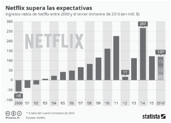 Del total de ingresos recibidos por Netflix, el 62,5% son provistos por el negocio de streaming doméstico y el 22,9% por el negocio de streaming internacional, generando una utilidad neta de 3,55% para el trimestre 4 de 2016, siendo afectado por impuestos en un 0,45%, teniendo una rentabilidad antes de impuesto del 4%, lo cual prevé un margen de tributación bajo respecto al presentado por la industria audiovisual, que es del 5,51%, en la cual posee una participación del 40%.