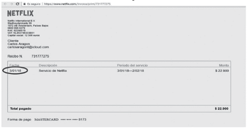 Teniendo en cuenta que el presupuesto fáctico del hecho generador del impuesto sobre las ventas es el momento de causación del mismo, conforme lo previsto en el Artículo 429 del Estatuto Tributario, en concordancia con el Concepto DIAN 29351 de 2015, en el licenciamiento de la tecnología de streaming realizado por la sociedad extranjera Netflix en el territorio nacional, se puede precisar que dicho licenciamiento es continuo, ya que el suscriptor puede usar en el momento que desee dicha tecnología para acceder a contenido ilimitado de carácter digital desde casi cualquier tipo de dispositivo que tenga acceso a internet y, teniendo en cuenta la Administración Tributaria colombiana, no posee tecnología o infraestructura por parte de la administración tributaria para gravar con el impuesto sobre las ventas cada descarga realizada, y ciñéndose a lo previsto en la normatividad mentada respecto a la primacía del evento que cause el impuesto, el legislador, con base en las sugerencias de la OCDE propuestas en la Acción 1 BEPS y expuestas en el primer capítulo de este trabajo, determinó que el momento de causación del impuesto sobre las ventas en el licenciamiento de la tecnología de streaming realizado por las sociedades extranjeras en el territorio nacional, es con la generación de la factura o documento equivalente, pues es claro que la misma se genera previo al pago, como se puede apreciar en las siguientes ilustraciones de la factura y pago del servicio de Netflix de un usuario en Colombia.
