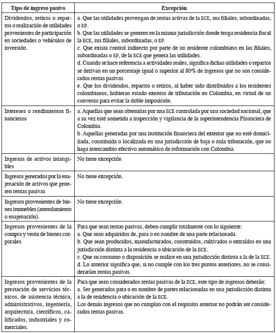 En cuanto a las rentas provenientes del arrendamiento o cesión temporal de bienes inmuebles, nuestra legislación no hizo ninguna excepción desconociendo así actividades reales que se realizan en este tipo de negocios, mientras que en el caso de Perú y Chile sí existe la excepción con referencia a estas rentas. Es importante aclarar que la renta de bienes inmuebles no está considerada con renta pasiva según el reporte final de la OCDE de 2015.