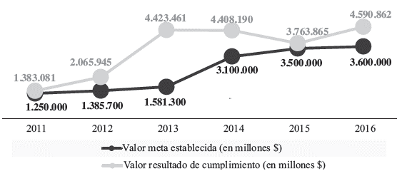 Así las cosas, en la gestión operativa del control tributario se ha sobrecumplido dicha meta establecida en el periodo de enero de 2011 a diciembre de 2016 en un 159,2%, toda vez que se han proferido actos oficiales ejecutoriados y no ejecutoriados que respaldan sumas por $22,95 billones cuando la meta se ha fijado en $14,41 billones, resultados que para el año 2016 reflejan un alto sobrecumplimiento.