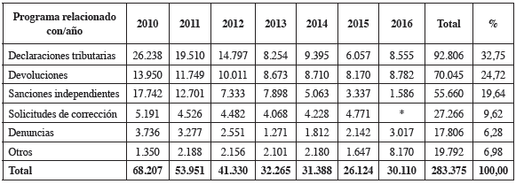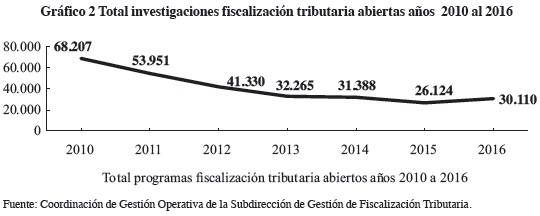 De un análisis del número de las investigaciones de fiscalización abiertas relacionadas con declaraciones tributarias, se observa una disminución en su cantidad, que desde el año 2010 al año 2016 se ha visto reducida en más de una cuarta parte (véase gráfico 3)