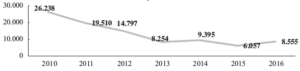 El mismo comportamiento anterior se observa respecto al incremento en el número de responsables del régimen común, cuya tendencia en 2010-2016 frente a la disminución en el número de investigaciones tuvo el siguiente comportamiento (véase cuadro 15).