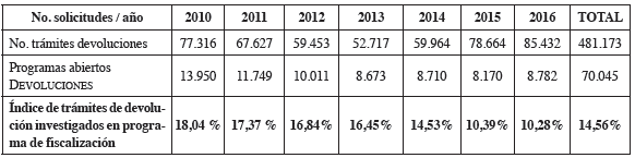 Del cuadro anterior, se observa que dentro de los años 2010-2016 se realizaron 481.173 solicitudes de compensación y/o devolución (DIAN, 2017), de las cuales 70.045 fueron evaluadas en el proceso de fiscalización tributaria, lo que representa que el 14,56% de las solicitudes elevadas a la DIAN, además de pasar por los controles establecidos en el proceso de Recaudación, tuvieron evaluación así fuera de carácter formal en las áreas de Fiscalización mediante el programa Devolución Impuestos "DI", en el que se efectúa un análisis preliminar dentro del proceso de fiscalización tributaria.