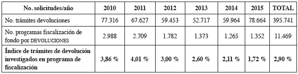 No obstante, en cuanto al adelantamiento de programas de fondo abiertos en la gestión de fiscalización tributaria en los años 2010-201510, solo se adelantaron un total de 11.469, por lo que casi tres (3) de cada cien (100) solicitudes de compensación y/o devolución, tuvieron un control tributario de fondo de parte del proceso de fiscalización, de la forma así expuesta (véase cuadro 12).
