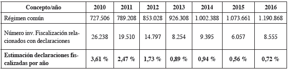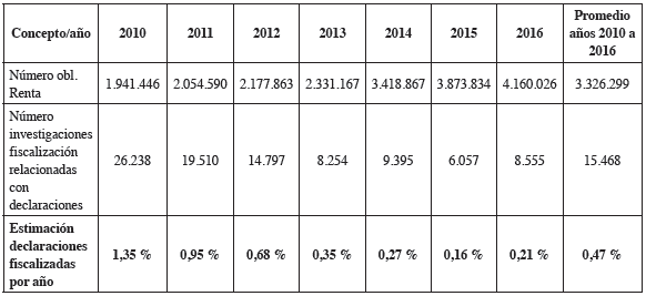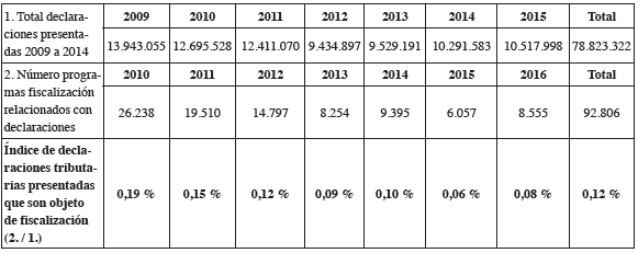 Por otra parte, el número de declaraciones presentadas en 2009-2016 ha presentado variaciones constantes. Sin embargo, se ha puesto dentro de un rango de 9,4 millones a 13,9 millones, volumen que frente al número de investigaciones de fiscalización abiertas relacionadas con declaraciones, refleja un alcance muy reducido del control intensivo.