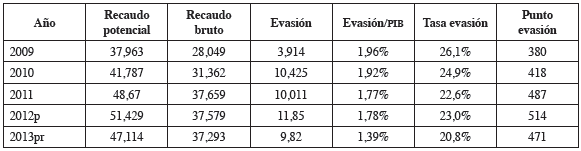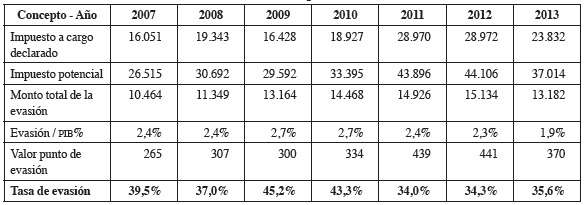 Por otra parte, a pesar de no contar con cifras actualizadas de medición de la evasión en renta como ya se ha indicado, se considera que la evasión en este impuesto, en la actualidad, puede presentar una tendencia similar o mayor a la observada en el último año analizado que correspondió al año 2013.