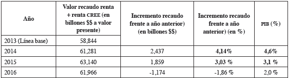 Por consiguiente, si se observan los incrementos de recaudo en el impuesto de renta y el hoy inexistente impuesto de renta para la equidad CREE para los años 2014-2016, que se ubican en 4,14%, 3,03% y -1,86% respectivamente frente al año anterior al analizado, no se encuentra que estos comportamientos sean consistentes con el incremento en la producción nacional (PIB), donde los incrementos del PIB generan mayores ingresos para la economía en general y para los diversos agentes económicos, pero no produjeron un mayor recaudo de impuesto de renta y CREE, por lo que las estimaciones oficiales de evasión que para renta personas jurídicas del año 2013 la ubicaban en 35,6% permitirían inferir que para los años 2014 a 2016 reflejarían unas tasas de evasión mayores, lo que hace imperiosa la necesidad de fortalecer las administraciones tributarias y la eficacia del control y fiscalización tributaria para que el incremento en la producción nacional derive un incremento en el recaudo tributario del impuesto sobre la renta.