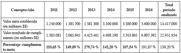 Dentro del periodo de enero de 2011 a 2016, se han establecido metas de gestión efectiva que suman un total de $14,417 billones de pesos, y cuyos resultados de gestión (actos ejecutoriados y no ejecutoriados) han arrojado las siguientes cifras (DIAN, 2017) (véase cuadro 6).