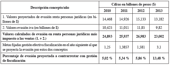Comparadas las cifras anteriores, se observa que las proyecciones de evasión en renta jurídicas y en IVA señalan que para los años 2010-2013, esta se ubica entre $23 y $26,9 billones, y las metas de gestión efectiva de fiscalización se establecieron en $1,25 a $3,1 billones, donde si bien las metas, así como los cálculos de evasión, se incrementan, los mayores valores de metas de los años analizados (con excepción del año 2013) se mantienen relativamente constantes, encontrándose que el cumplimiento de la gestión efectiva de fiscalización no ha producido una disminución o alteración alguna en los índices de evasión, y a pesar de que la evasión en IVA para el año 2013 presenta una disminución de un poco más de $2 billones frente al año anterior, no se debe perder de vista que, como se señaló, otros análisis arrojan resultados que ubican la evasión en este impuesto en el doble de dichos estudios económicos oficiales, por lo que el cumplimiento de las metas no ha contribuido a disminuir la evasión, conforme a las cifras estimadas.