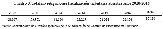 En consecuencia, dicho número de investigaciones abiertas en 2010-2016 se redujo drásticamente en un 67,40%, lo que refleja una política de control tributario tendiente a reducir el control intensivo en lo referente a la revisión de declaraciones tributarias.