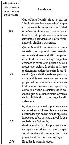 En caso de que sea Colombia, se le deberá conceder al contribuyente colombiano la posibilidad de descontar de su impuesto de renta debido en Colombia, el impuesto soportado en el Japón, sujeto a las limitaciones de la normativa doméstica colombiana (por ejemplo, el límite a los descuentos del artículo 259 del ET).