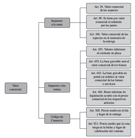 El Estatuto Tributario trae en un número importante de su articulado el término valor comercial, pero no ha tenido un desarrollo normativo adecuado y no existe en la doctrina ni en la jurisprudencia una fórmula técnica de cómo desarrollarlo; tanto el Código de Comercio como en la norma internacional confluyen algunos elementos comunes, como son:
