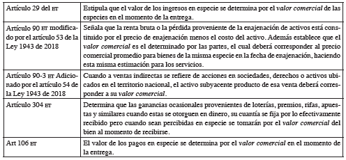 En el Artículo 29 del Estatuto Tributario se detalla que el valor de los ingresos en especie que sean constitutivos de ingresos, estará determinado por el valor comercial de las especies en el momento de la entrega.
