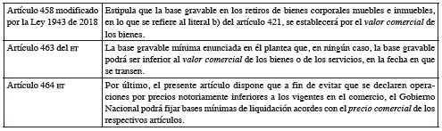 Igual término es utilizado en el primer inciso del artículo 463 cuando refiere que la base gravable no podrá ser inferior al valor comercial de los bienes o de los servicios, en la fecha de la transacción.