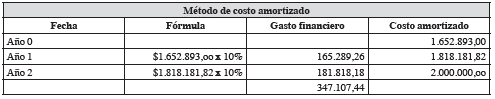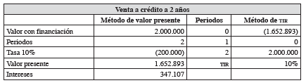 El segundo supuesto se conoce el valor actual (de contado) del bien a vender ($1.652.893) y también se sabe cuál es el valor que debería cobrar a futuro incluida la financiación ($2.000.000). Como se necesita reconocer cuánto le corresponde de financiación a cada uno de los periodos, se requiere hallar la tasa que hace equivalente dicho valor. Para ello debe recurrirse a la fórmula financiera de la Tasa interna de Retorno, TIR.