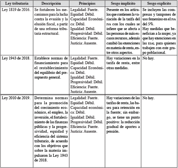 De las últimas reformas tributarias de 2016, Ley 1819, y las reformas de 2018 y 2019, leyes 1943 y 2010, respectivamente, se deduce que en la reforma de 2016 se introduce un enfoque de género limitado, explícito para algunos Bienes de la mujer y constituye un sesgo positivo, es un avance normativo que se refuerza con la Sentencia C-117 de 2019, de la Corte Constitucional.