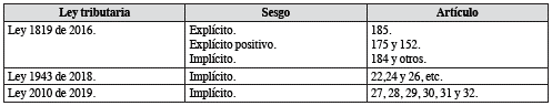 En las tablas 1 y 2 se ilustra una demarcación de las leyes tributarias: Ley 1819 de 2016, Ley 1943 de 2018 y Ley 2010 de 2019: