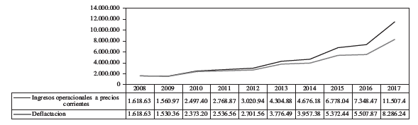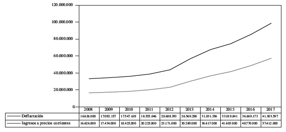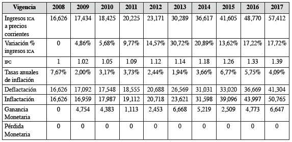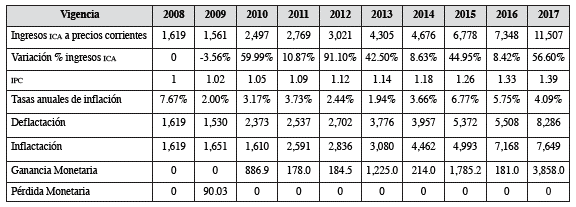 En la anterior tabla se pueden observar los ingresos tributarios por industria y comercio con su respectiva deflactación22; es importante resaltar que no siempre el incremento en los ingresos se da por el aumento en los precios de mercado o en la productividad de un negocio, sino que este puede ser producto de los índices económicos del país, como es la inflación.