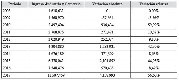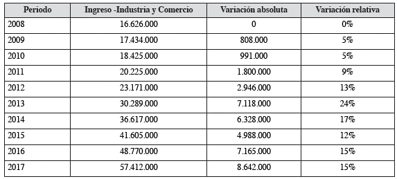 En este mismo sentido, los ingresos por concepto de Impuesto de Industria y Comercio durante los años 2008-2013 muestran una tendencia creciente. De esta manera, para los años 2008- 2009 se registró un crecimiento significativo en el Impuesto de Industria y Comercio con una variación absoluta del 5%; entre los años 2009-2010 creció un 5%; para los años 2010-2011, un 9% y, por último, entre el año 2012 y 2013 creció un 24% en industria y comercio.