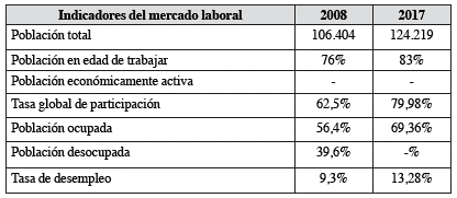 Finalmente, es importante resaltar el impacto que ha tenido la tasa de desempleo del Municipio de Rionegro a causa del asentamiento de nuevas empresas, por lo cual se muestra una serie de indicadores del mercado laboral realizando una comparación entre los años2008 y 2017.