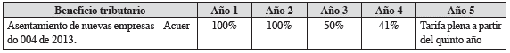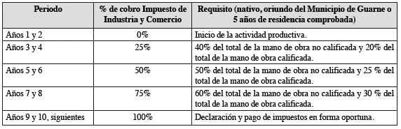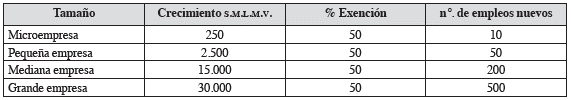 Las empresas que generen nuevos empleos tendrán derecho a las exenciones del Impuesto de Industria y Comercio sobre el mayor crecimiento con respecto al incremento del salario mínimo legal vigente comparados los dos últimos periodos de la respectiva declaración de la siguiente forma: las exenciones serán del 50% siempre y cuando las microempresas generen 10 nuevos empleos, la pequeña empresa 50 nuevos empleos, mediana empresa, 200 nuevos empleos y gran empresa, 500 nuevos empleos.