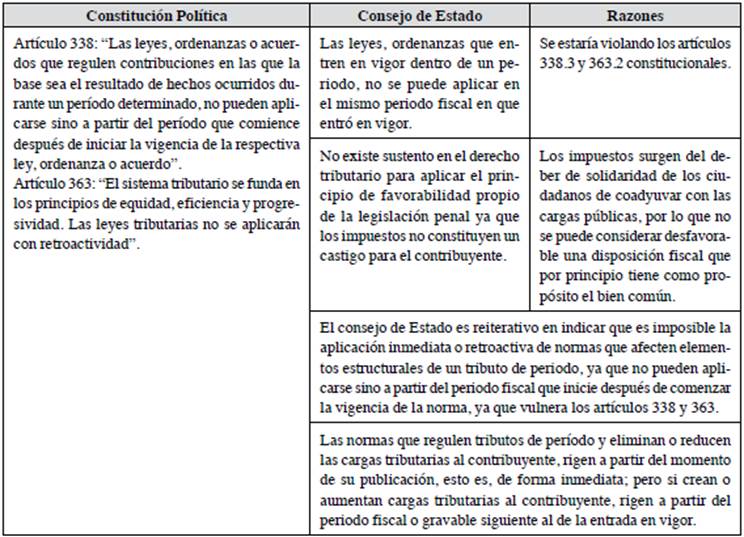 En referencia al principio de no retroactividad de la ley tributaria, justicia y equidad el artículo 363 expresa: "El sistema tributario se funda en los principios de equidad, eficiencia y progresividad. Las leyes tributarias no se aplicarán con retroactividad".