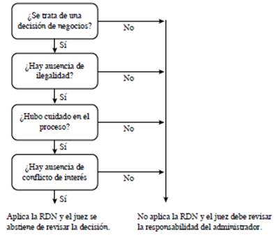 Dependiendo del caso, el juez que conozca la controversia deberá abstenerse de revisar la responsabilidad del administrador si en efecto hubo una (1) decisión de negocios, (2) con ausencia de ilegalidad, (3) con cuidado en el proceso y (4) con ausencia de conflicto de interés, esto en aplicación de la regla de la discrecionalidad en los negocios. De lo contrario, no se podrá abstener de revisar la conducta y deberá revisar la responsabilidad del administrador bajo los estándares de la normativa sobre responsabilidad de los mismos.