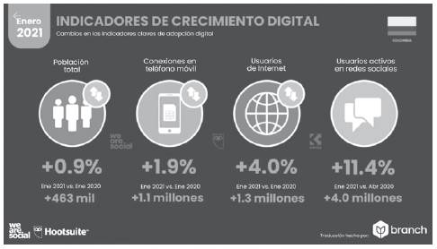 Así mismo, vale analizar el resumen general que nos ofrece Branch (2021) sobre el uso del internet en Colombia desde enero de 2020 hasta enero de 2021 (figura 2):