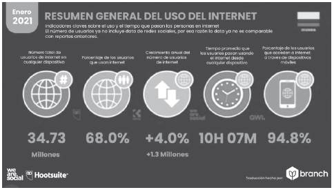 Estos 34,7 millones de usuarios invierten aproximadamente 10 horas y 7 minutos al día en navegar en internet desde cualquier dispositivo (smartphone, tablet, laptop, consola de video juego y TV, entre otros), aunque el 94 % de ellos accede a este servicio, principalmente, desde su smartphone (Branch, 2021).