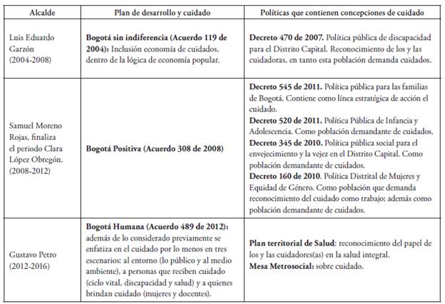 De acuerdo al periodo de estudio, las administraciones distritales a revisar, desde 2000 hasta 2015, son: Antanas Mockus, del 2001 al 2004, con "Bogotá para vivir todos del mismo lado"; Luis Eduardo Garzón, del 2004 al 2008, con "Bogotá sin indiferencia"; Samuel Moreno, del 2008 al 2012, con "Bogotá positiva" y Gustavo Petro, del 2012 al 2016, con "Bogotá Humana". En los planes de desarrollo de los exalcaldes Luis Eduardo Garzón y Gustavo Petro hay una mención concreta al cuidado, por ello se analizarán algunas políticas de estas administraciones que refieren al mismo y a la protección de la vida.