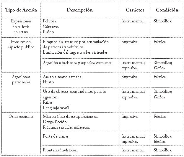 Podría categorizarse el tipo de violencia de carácter instrumental, la cual "admite en algunos casos transacciones y regateo entre lo que se concede y lo que se niega" (Savater, citado por González y Villacorta 1998, 1), lo cual responde a demandas más o menos concretas y no a reivindicaciones de carácter político y económico. También se categoriza el tipo de violencia expresiva, o bien simbólica, puesto que estas acciones en sí mismas son un medio y un fin. Lo anterior puede ejemplificarse en el barrio Florida Nueva, a partir de la identificación de cierta tipología de acciones -evidenciadas en el material empírico analizado- que dan cuenta tanto de la violencia fáctica como la simbólica, entre otras: expresiones de euforia colectiva - pólvora, cánticos, ruido-, invasión del espacio público -bloqueo del tránsito por acumulación de personas y vehículos, limitación del ingreso a las viviendas, agresión a fachadas y otros espacios comunes-, agresiones personales -asalto a mano armada, hurto, riñas, uso de objetos contundentes para la agresión, lenguaje hostil- y otras acciones -como porte de armas, microtráfico de estupefacientes, drogadicción, prácticas sexuales callejeras, fronteras invisibles-.