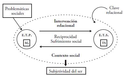 Por los motivos expuestos, los escenarios laborales de asistencia social son portadores de la herencia del sufrimiento social y he aquí la importancia de este fenómeno social que emerge como problema en el ámbito de la salud ocupacional, debido a que el ETS adquiere una permanencia y reproducción de carácter circular en la trama de las relaciones que consolidan el fenómeno. A través del proceso de intervención se externaliza el sufrimiento del sujeto que -por su naturaleza, frecuencia y tiempo de duración- adquiere un efecto acumulativo al contacto con el sufrimiento interno del mismo trabajador social, quien activa reacciones emocionales, haciendo suyo el sufrimiento del otro, contaminándose por la misma dinámica de intervención. De esta manera, se concibe que la trama de relaciones establecida mediante el proceso de intervención puede ser condicionante de riesgo primario e indisoluble para el desarrollo y permanencia del ETS.