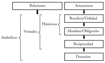 Para el paradigma relacional, dentro de la relación social existen cuatro modos paradigmáticos de actuar (Donati 2004): 1) actuara por utilidad o beneficio, donde la motivación del actuar es la búsqueda de la utilidad; 2) actuara por mandato u obligación, que corresponde a la norma legitima de cualquier poder o autoridad; 3) actuara por reciprocidad, que responde a un intercambio simbólico que consolida la relación afirmando el valor intrínseco de una relación social -el resultado de la acción no es inmediato ni directo, es indirecto y dilatado en el tiempo-; 4) actuara para donar, consiste en el acto en el cual el ego afirma el valor del alter, ofreciéndole algo para su bienestar, sea material o inmaterial, independientemente que preexista una relación social entre ego y alter.