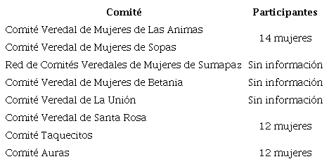Los comités se componen de un número variado de participantes dependiendo de la vereda específica y el territorio que representan; cuando las mujeres constituyen estos comités, ejecutan la organización de estos, estableciendo roles y papeles que permitan visibilizar una estructura organizada, delegando cargos: una presidenta, una secretaria y la tesorera. Así mismo, se reúnen y eligen una representante que participa directamente en el consejo local de la localidad. Ante esa posibilidad de amplitud de la incidencia veredal a lo local, las prácticas de la participación de las mujeres se orientan a posicionar asuntos que requieran atención para sus búsquedas e intereses como mujeres rurales, como la apertura de espacios para disfrutar del tiempo libre, asunto que en el ámbito de la ruralidad es casi inexistente, más aún en las mujeres.