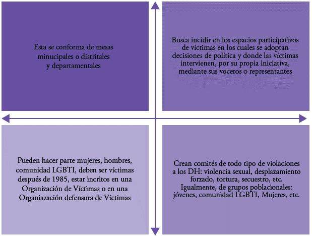 De esta manera, las víctimas participan directamente en la Mesa Nacional de Víctimas5, y algunos miembros de estas participan en los consejos directivos de la Unidad de Restitución de Tierras, la Unidad de Atención y Reparación Integral para las Víctimas, los Comités Territoriales de Justicia Transicional y en el Centro Nacional de Memoria Histórica. La Mesa Nacional de Víctimas6, desde entonces, es un espacio institucional reconocido para que las víctimas participen y que cuenta con un protocolo7 para desarrollar sus actividades; dentro de las características generales de este espacio se encuentran las descritas en la figura 2.